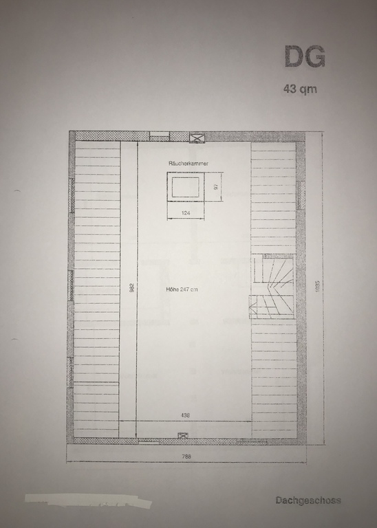 Auf dem Dachboden befindet sich auch noch eine Räucherkammer von 124 cm x 97 cm.