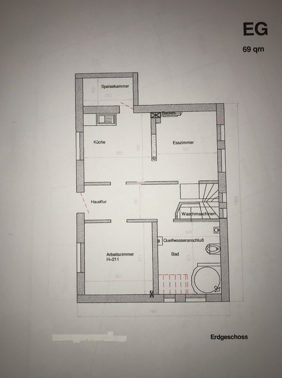 Flur, Küche, Abstell, Esszimmer, Arbeitszimmer, großes Bad mit Wanne und Duschabtrennung