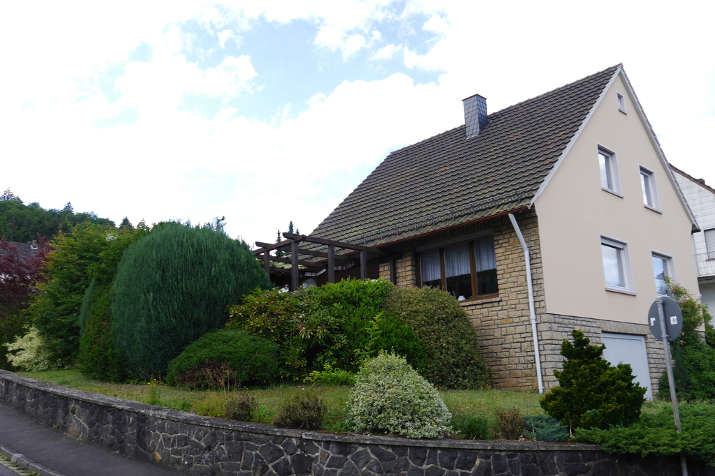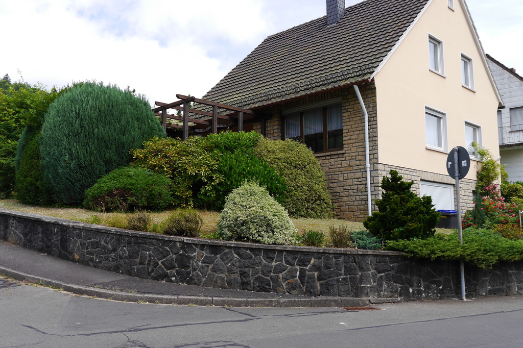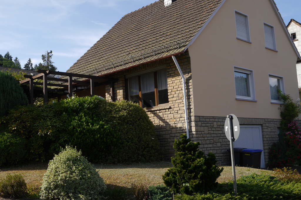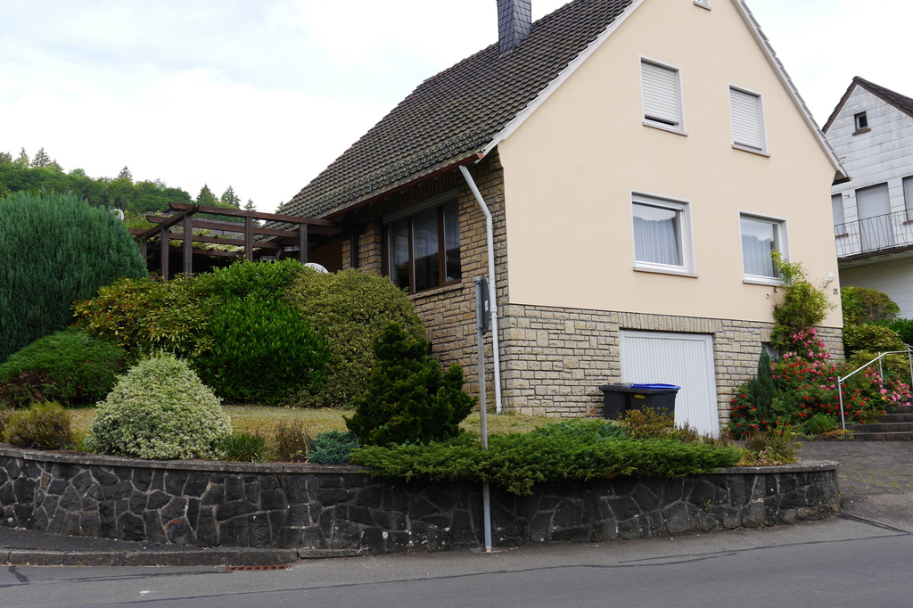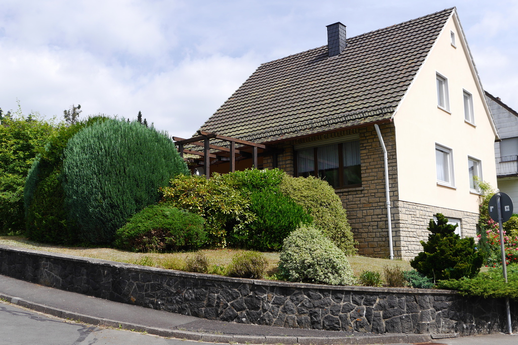 Das Einfamilienhaus mit Garage und großer Terrasse wurde 1958 in Massivbauweise auf einem Eckgrundstück erstellt. Umfriedet ist das Grundstück zur