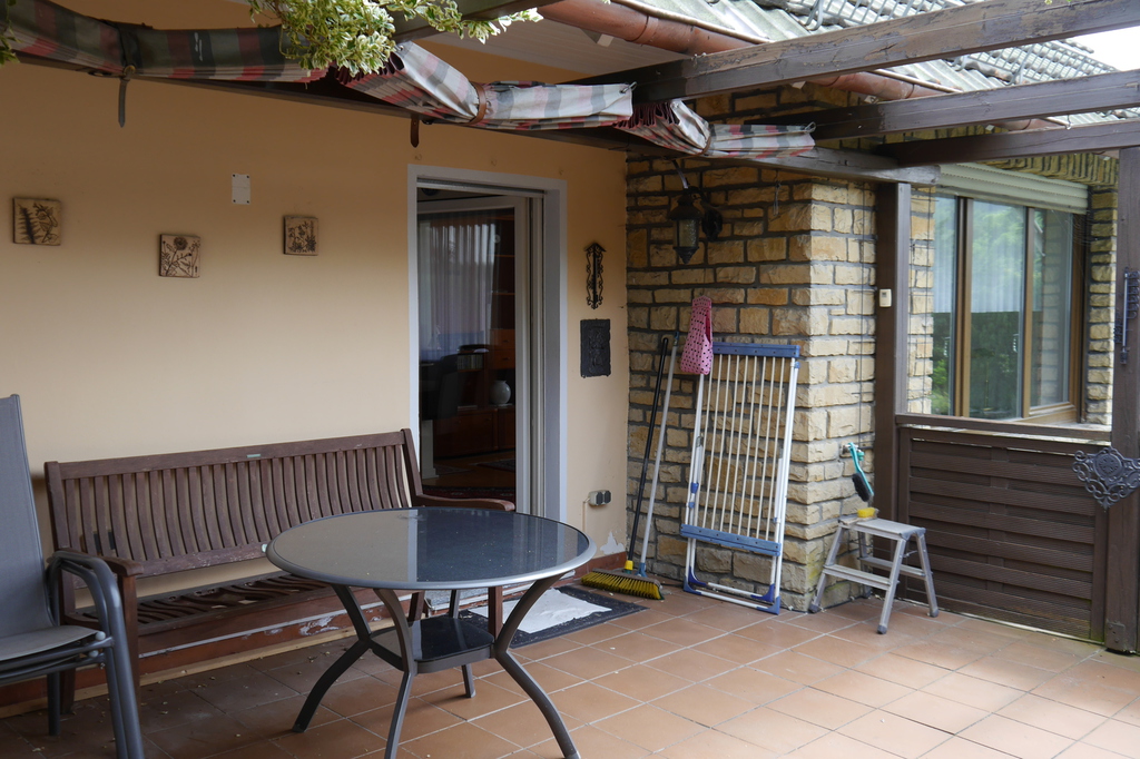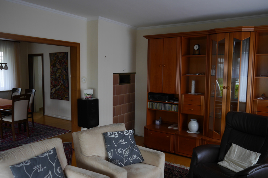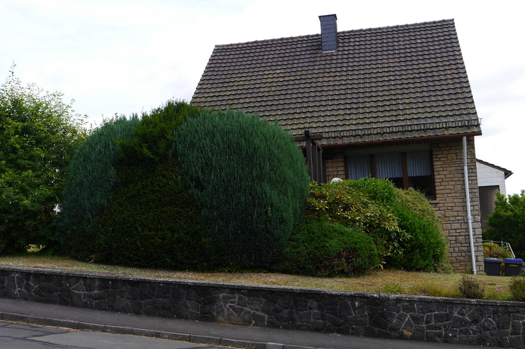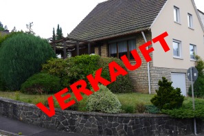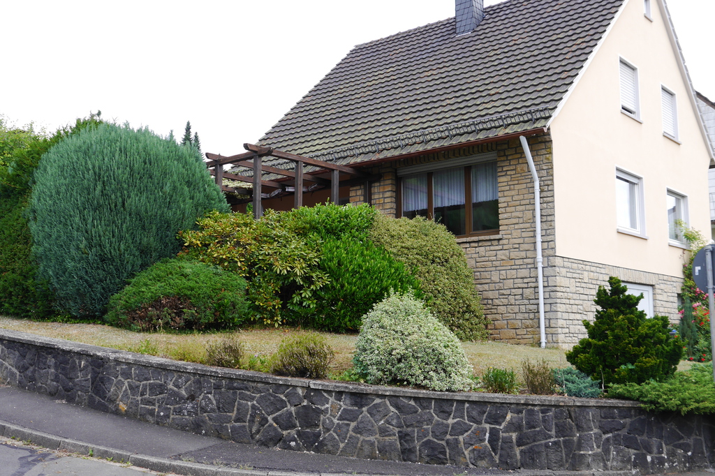Das Einfamilienhaus mit Garage und großer Terrasse wurde 1958 in Massivbauweise auf einem Eckgrundstück erstellt. Umfriedet ist das Grundstück zur