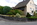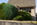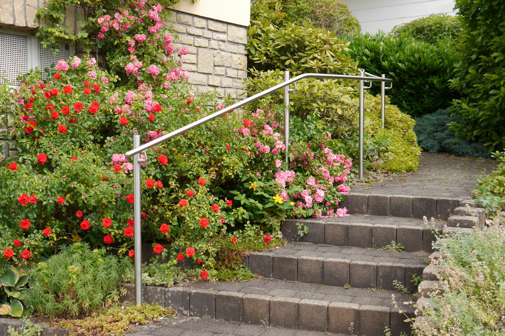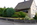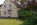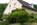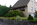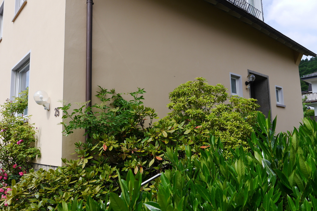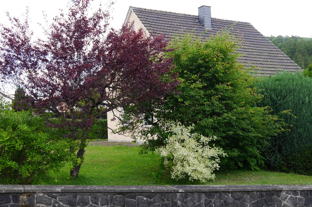 Straßenfront mit einer Natursteinmauer; bewachsen ist es mit Sträuchern und der rückwärtige Teil ist ebenerdig in Rasen angelegt.