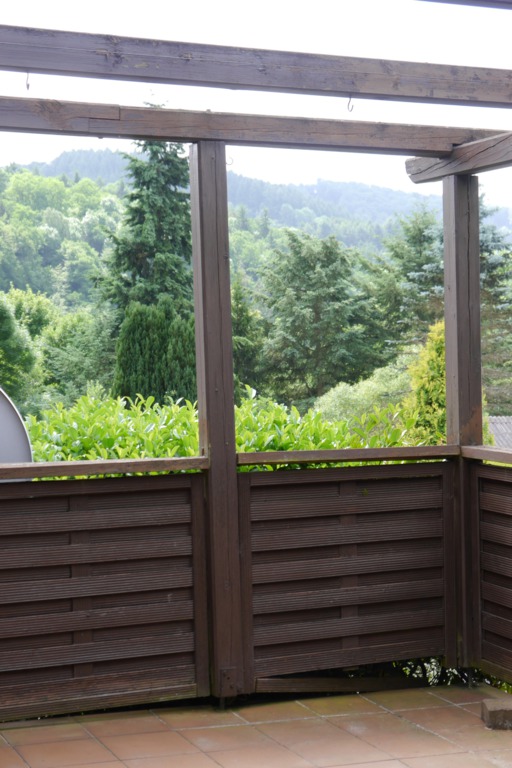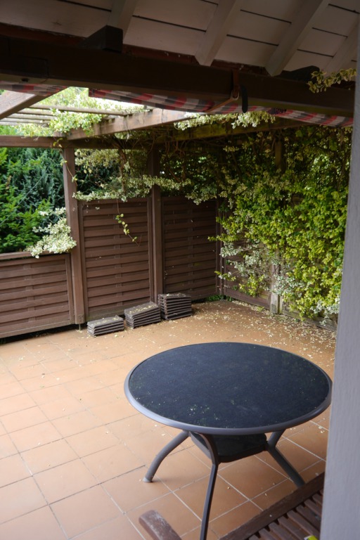 Zum Südwesten gibt es eine große geflieste Terrasse (nicht einsehbar) mit Pergola. Das UG des Hauses ist von außen mit einem Natursteinmauerwerk verkleidet. Eingedeckt ist das Satteldach mit dunkeln