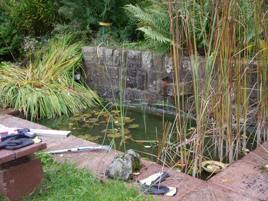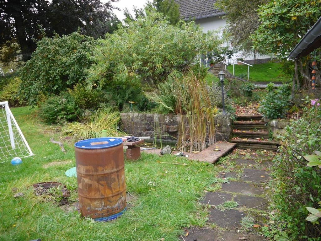 Vom Wohnzimmer gelangen Sie zur überdachten 23.4 m² großen Sonnenterrasse und in den großen Gartenbereich, in dem ein kleiner Gartenteich angelegt ist.