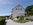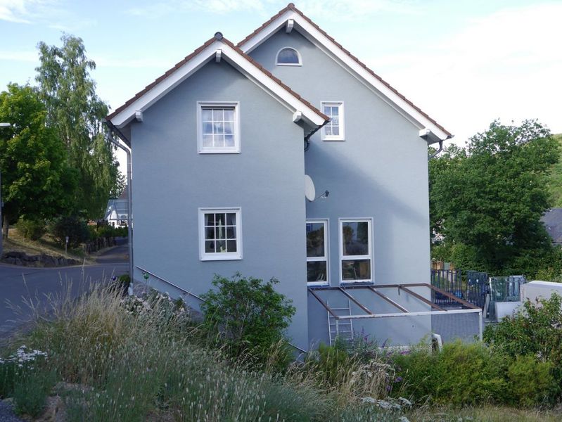 Das Satteldach der Immobilie, 38 Grad-Neigung, ist in dunklen Betondachsteinen gedeckt. Die Außenfassade befindet sich in hellen Putz.