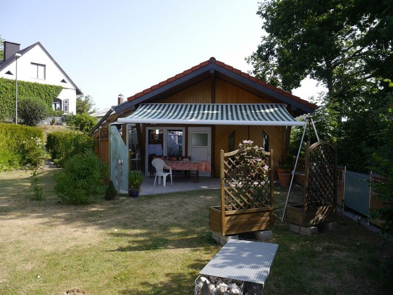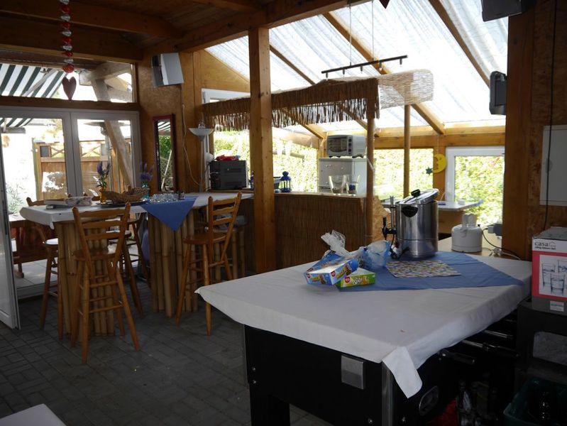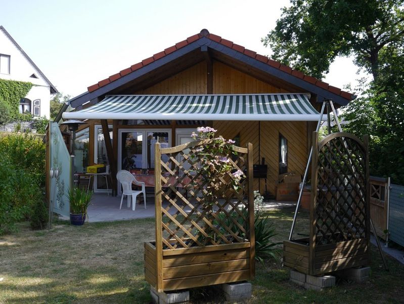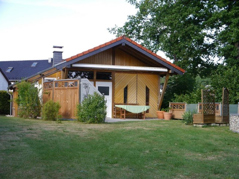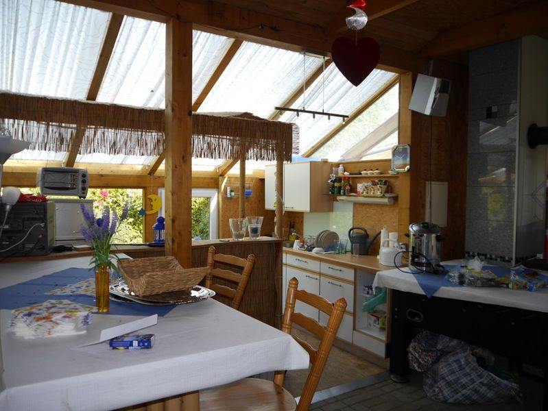 Das ca 40 m² große Holzgartenhaus ist komplett eingerichtet, incl einer Toilette und Küche und kann eine ganze Hochzeitsgesellschaft auf-nehmen.