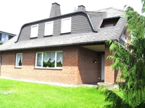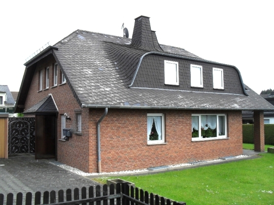 Krüppelwalmdach mit großer Dachgaube im OG, Kunstschiefereindeckung |