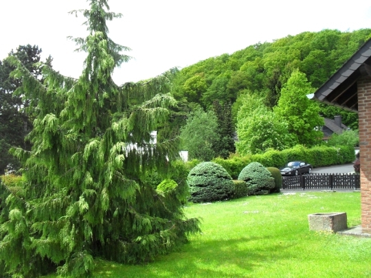 ebenerdige Rasengrundstück ist mit Baum- und Strauchbewuchs bewachsen und ist