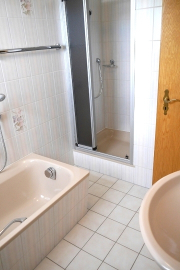 Ca. 79 m² Diele, Küche mit Abstellraum, Esszimmer, Schlafzimmer mit TV-Anschluss, Bad mit Dusche, Gäste-WC, großes Schlafzimmer mit kleiner Dachterasse und Fernblick über das Pützborner Tal |